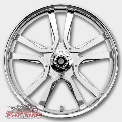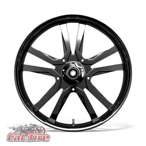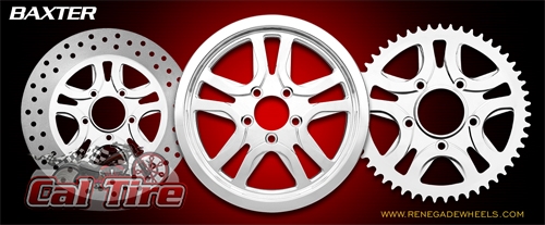 One of our newer designs this split 5-spoke wheel, called the Baxter, has a rock solid look. The unique way in which the spokes split works great on any bike, bagger or Dyna. Black Baxter shows off with stunning detail and Smooth contours, and will turn heads on any bike. Direct bolt on, with matching floating brake rotors in 11.5,11.8, 13 and 18 inch sizes you can complete your design package with a matching air cleaner, pulley or sprockets. We offer a full reange of sizes from 16" to 32".