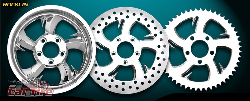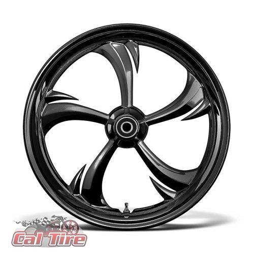 The Rocklin looks amazing on a custom build our Touring Bike with its unconventional 5 swept spoke design with barbs agrressively leading the way. The wheel is delivered in 16" to 32" sizes and now our new 18, 21,& 23 x 5.5 Wide Tire Front Wheel. Direct bolt on and ready to install, this wheel has matching floating brake rotors, air cleaner, pulley or sprocket to compliment your build.