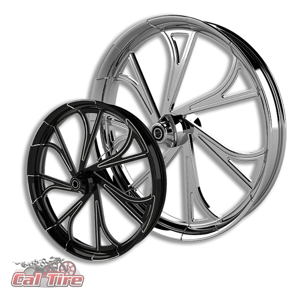 • These custom Blade Runner motorcycle rims come finished in your choice of unfinished, polished, chrome, gloss black, denim black, and contrast cut. Available sizes: 16”, 17″, 18″, 19”, 20″, 21″, 23″, 26″, 30”, 32” and 34″.