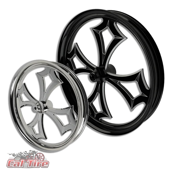• These custom Barbaric Tendencies motorcycle rims come finished in your choice of unfinished, polished, chrome, gloss black, denim black, and contrast cut. Available sizes: 16”, 17″, 18″, 19”, 20″, 21″, 23″, 26″, 30”, 32” and 34″.